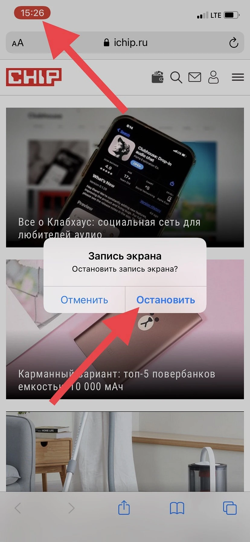 Для остановки записи экрана, откройте «Пункт управления» и нажмите кнопку записи экрана или нажмите меню статуса красного цвета в верхней части экрана, затем коснитесь кнопки «Остановить».