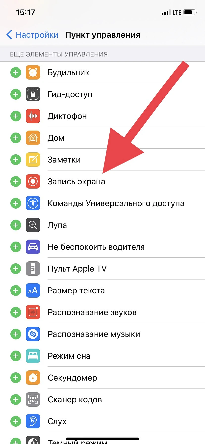 Для этого откройте «Настройки» > «Пункт управления», затем коснитесь рядом с параметром «Запись экрана».