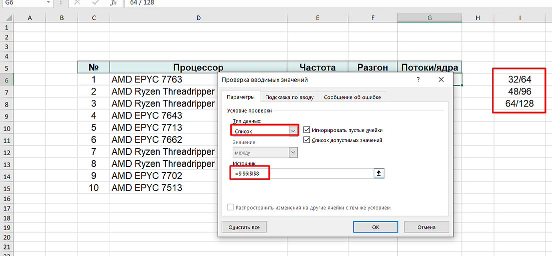 Теперь при создании ячейки с выпадающими значениями можно выбирать в качестве источника не диапазоны, а их названия. Например, указать здесь «=процы» (название действует только для определенного листа или книги Excel), можно получить список процессоров.