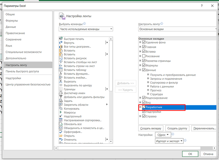 1. Включить режим разработчика. Для это следует кликнуть правой кнопкой мыши по ленте Excel, открыть настройки и поставить галочку напротив соответствующего пункта.