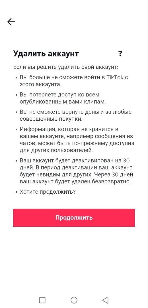 - Вас перебросит в новое меню. Тапните по графе «Удалить аккаунт». ТикТок отобразит условия удаления и попросить подтвердить свое решение с помощью кнопки «Продолжить». Если вы уверены в своем решении, смело нажимайте на нее.