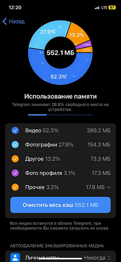 Например, в Telegram это делается так: заходим в «Настройки», нажимаем на «Данные и память», «Использование памяти» и «Очистить весь кэш». Ждите (сколько, зависит от объема кэша).
