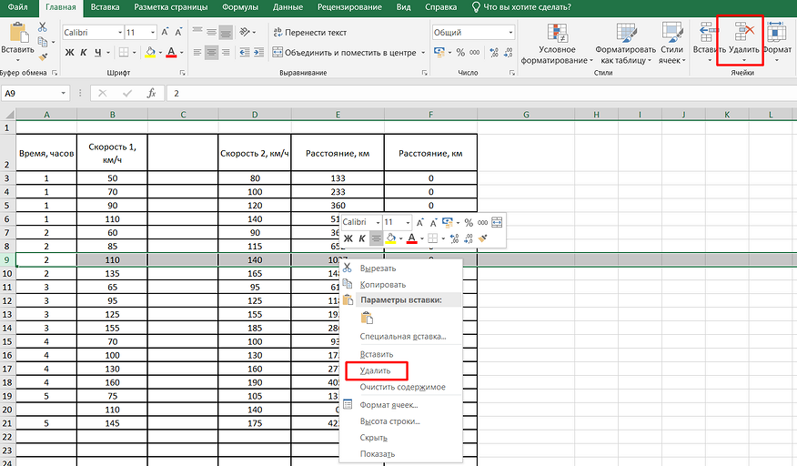 - Выбрать один из способов удаления строки или столбца. Это может быть команда «Удалить» в контекстном меню и выбор типа удаляемого элемента. Или нажатие комбинации Ctrl + «-». И даже иконка на панели инструментов в группе «Ячейки».