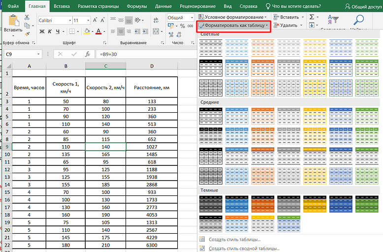- На главной вкладке выбрать элемент «Форматировать как таблицу».
