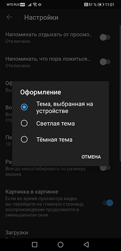 Ночную тему также можно использовать в приложении YouTube для iOS или Android. Процедура его активации немного отличается от инструкции для браузера.