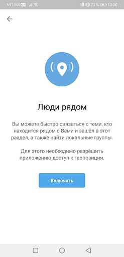 - Выберите пункт «Люди рядом». Программа предложит разрешить доступ к геопозиции для работы функции. Нажмите «Влючить» и активируйте GPS.