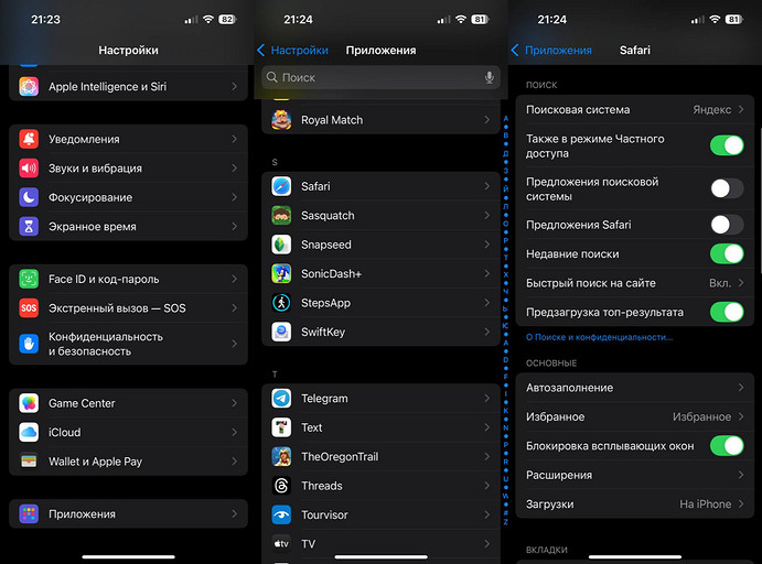 - Зайдите в Настройки → «Приложения» → Safari.