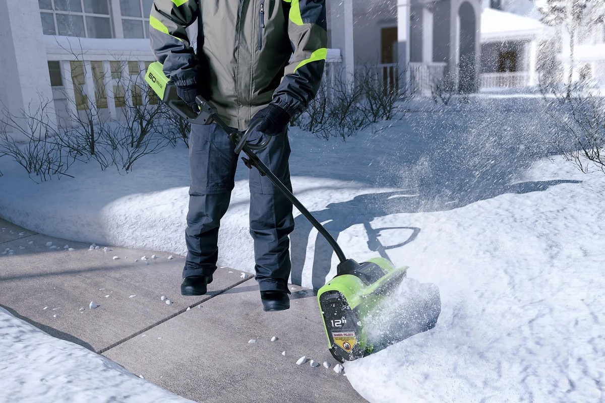 Многие мощные снегоуборщики имеют металлические шнеки — они хороши для уборки лежалого снега, но могут портить покрытие дорожек при неаккуратном обращении. Снеголопаты же оснащены пластиковыми шнеками. Такие точно не поцарапают брусчатку. Более того, если шнек налетит на камень или другой твердый предмет, лопату просто слегка подкинет — она легкая в отличие от аккумулятора.