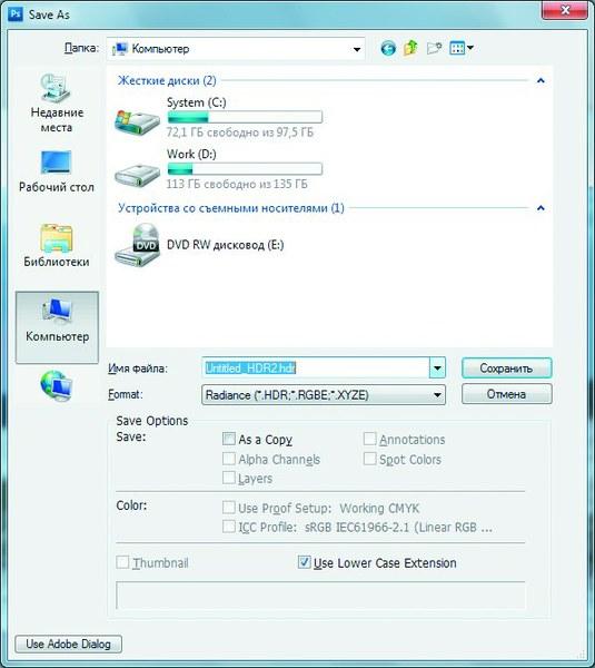 Еще одним важным отличием инструмента HDR в Photoshop является возможность сохранения результата в виде файла в формате HDR. Для этого необходимо в окне «Merge to HDR…» выбрать глубину цвета 32 бита. После этого при выполнении стандартной процедуры сохранения файлов HDR появится среди доступных вариантов.