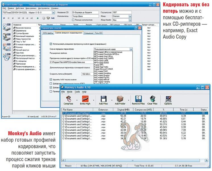 Для кодирования звука в lossless-форматы можно использовать не только универсальные приложения, о некоторых из которых мы расскажем ниже, но и обычные CD-рипперы. При работе с инструментами данного класса — например, бесплатными Exact Audio Copy (www.exactaudiocopy.de) или CDex (cdexos.sourceforge.net) — достаточно указать нужный кодек и значение битрейта в программных настройках сжатия. Однако этими инструментами пользуются немногие, предпочитая кодировщики с громкими названиями, зачастую коммерческие. Для компрессии звука без потерь можно использовать, в частности, нативные (оригинальные) продукты от разработчиков lossless-форматов. Ниже мы рассмотрим пять бесплатных программ, которые пригодятся вам при кодировании аудиодисков для своей цифровой коллекции.