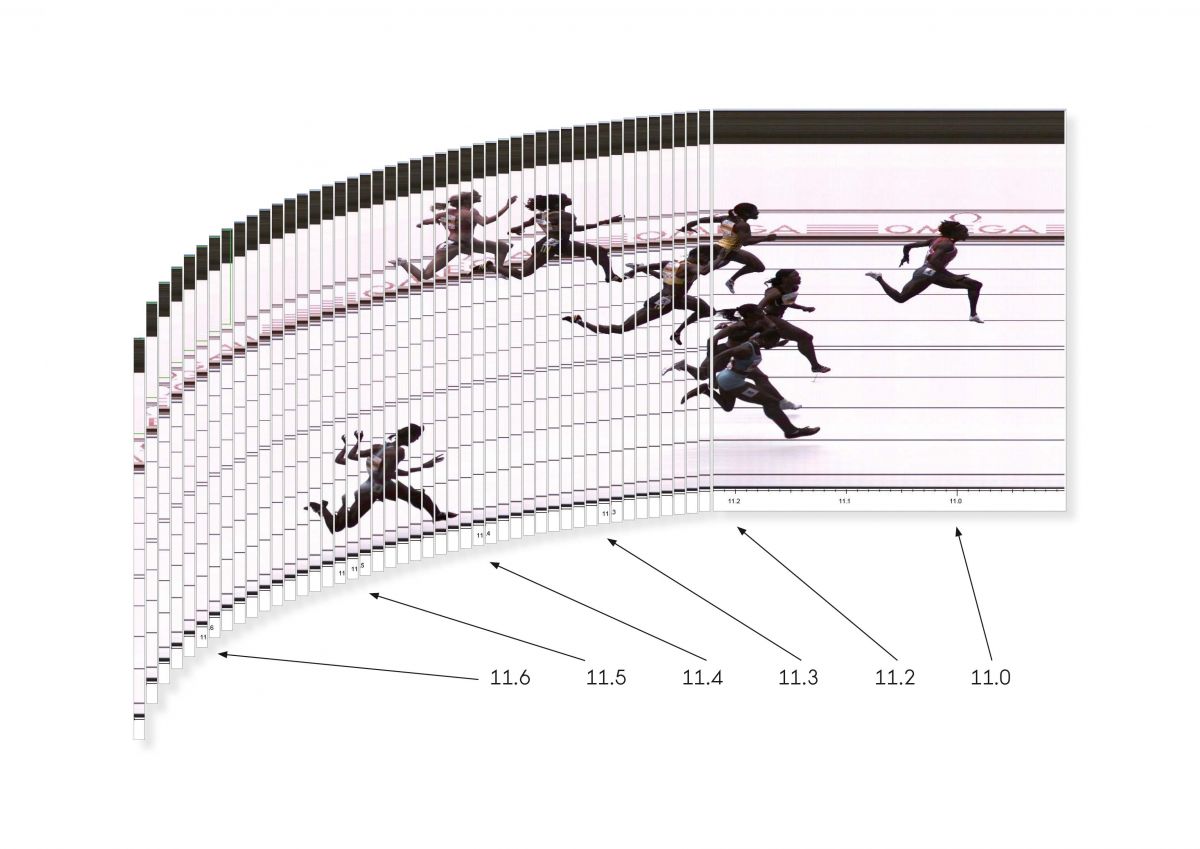 Растровые изображения с камеры фотофиниша собираются на компьютере. Так получаются кадры высокой четкости, показывающие положение бегуна в момент пересечения финишной черты.