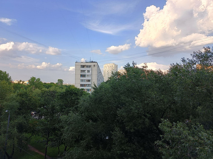 По качеству — не шедевр, но тут такой задачи и не стояло. Или на таком вот снимке из окна можно разглядеть, чем занимаются рабочие на стене соседнего дома.